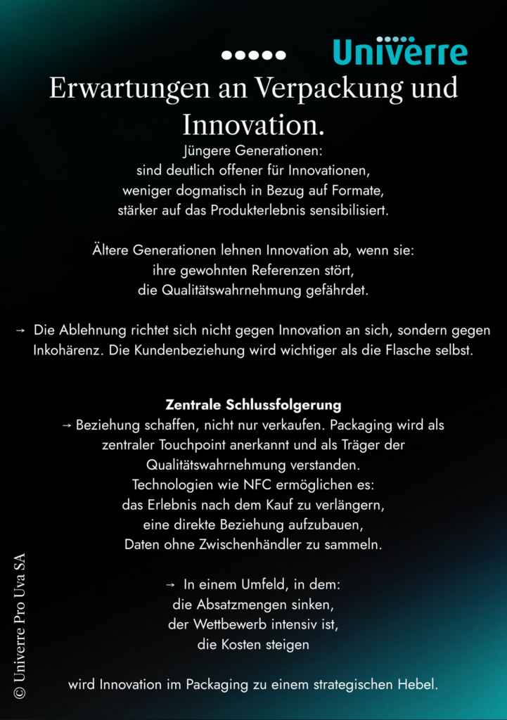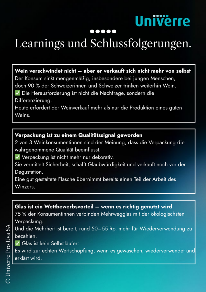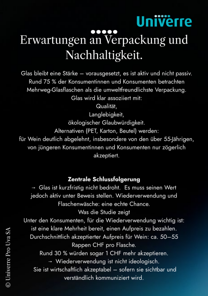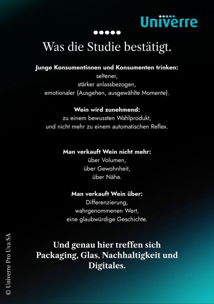 È proprio questo che mette in luce la grande indagine nazionale condotta da Univerre Pro Uva SA sulle abitudini di consumo e sulle tendenze del mercato delle bevande. I risultati sono chiari: il problema non è il vino, ma il modo in cui oggi viene proposto, presentato e valorizzato.