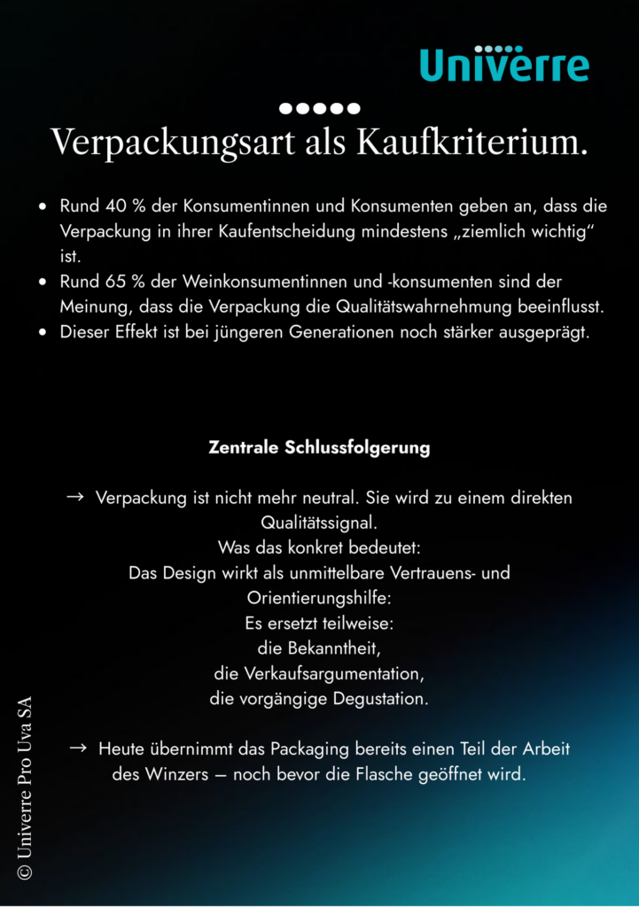 È esattamente ciò che Michel Schurch ha descritto con parole molto semplici: « Il primo contatto che abbiamo con una bottiglia è il suo aspetto visivo (…) quando il visivo è curato, porta una certa credibilità ».