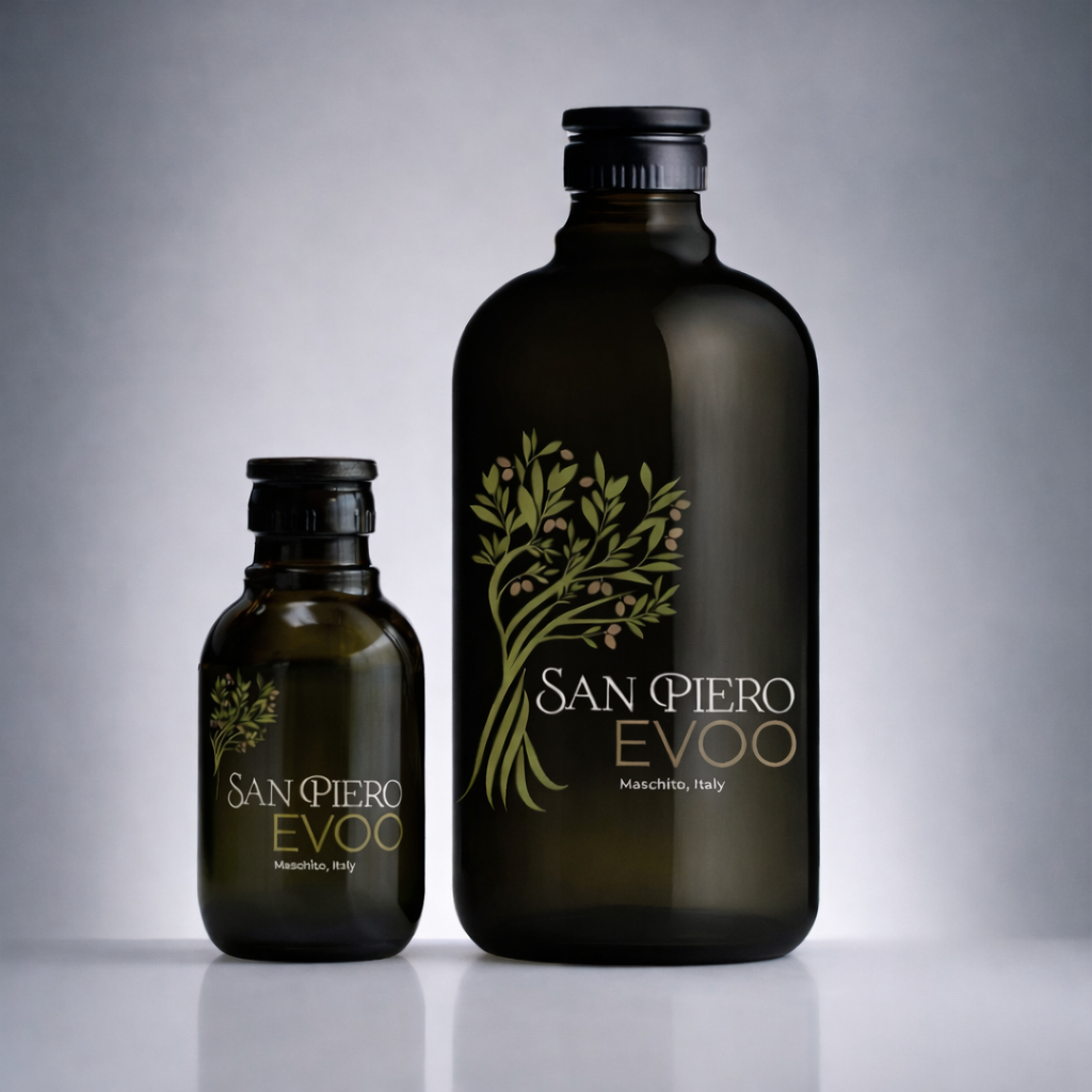Pour accompagner une huile d’olive souvent qualifiée d’« or jaune », la maison San Piero recherchait un packaging capable d’en exprimer toute la noblesse. L’étiquette, ornée de véritables touches d’or, apportait déjà une dimension premium, mais nécessitait une technique à la hauteur de ses ambitions. « La solution fut la sérigraphie — la meilleure méthode que nous ayons trouvée pour obtenir une étiquette de haute qualité, parfaitement fidèle à notre intention », expliquent les créateurs de San Piero. Très vite, la question du contenant s’est imposée : « Mais comment mettre en valeur de l’or liquide ? Nous avons réalisé qu’une bouteille ordinaire ne suffirait pas. Nous n’avons rien trouvé sur le marché qui reflétait vraiment la qualité premium de notre huile ».